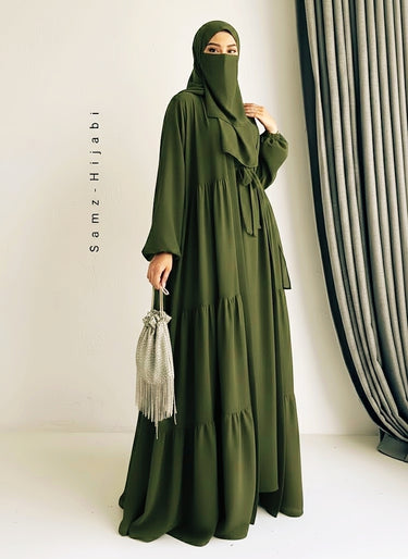A luxurious 5-piece set which has an elegant three-step frill upper that can be worn over the inner garment or styled separately for versatile looks. The set includes an Abaya, upper inner, belt, Hijab, and Naqab, all crafted from premium Korean Georgette for a soft, flowing finish. The design offers modest elegance with the option to wear the frilled upper independently, adding flair to any outfit.