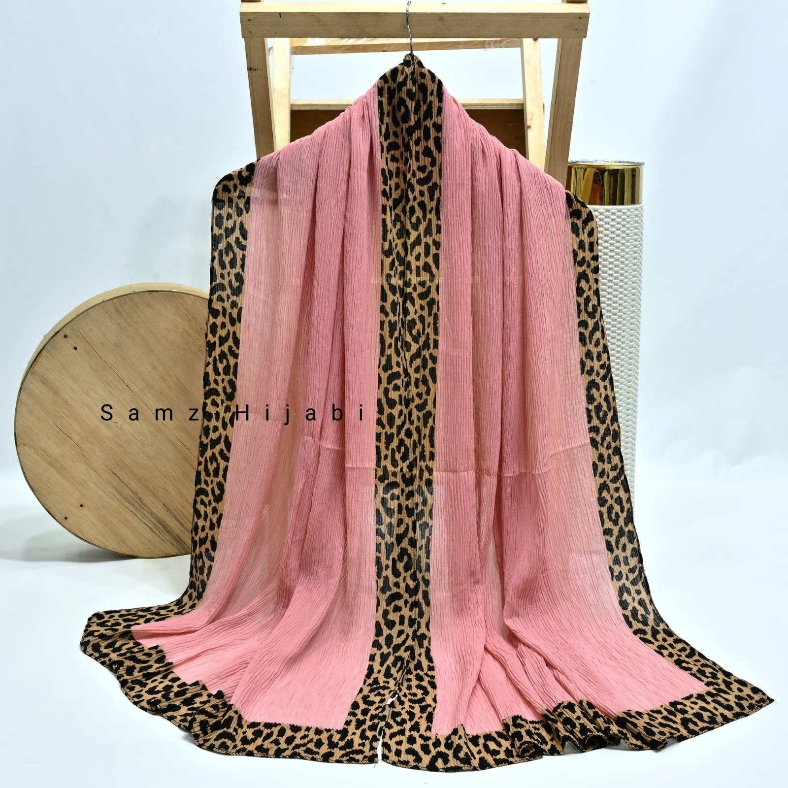 "Introducing Samzhijabi's stunning Cheetah Crinkle Hijabs - perfect for summer with a lavish touch! Pair these stylish scarves with trendy outfits or abayas for a chic look. The unique cheetah border on crinkle fabric adds a touch of elegance, making it hard to resist!