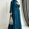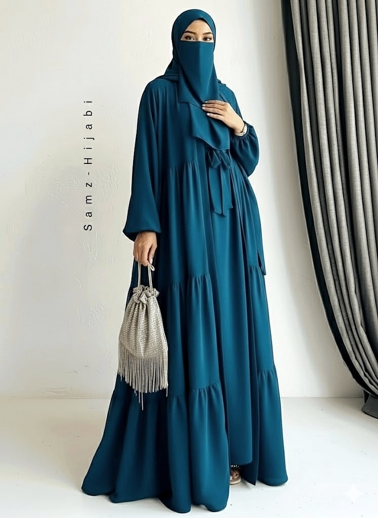 A luxurious 5-piece set which has an elegant three-step frill upper that can be worn over the inner garment or styled separately for versatile looks. The set includes an Abaya, upper inner, belt, Hijab, and Naqab, all crafted from premium Korean Georgette for a soft, flowing finish. The design offers modest elegance with the option to wear the frilled upper independently, adding flair to any outfit.