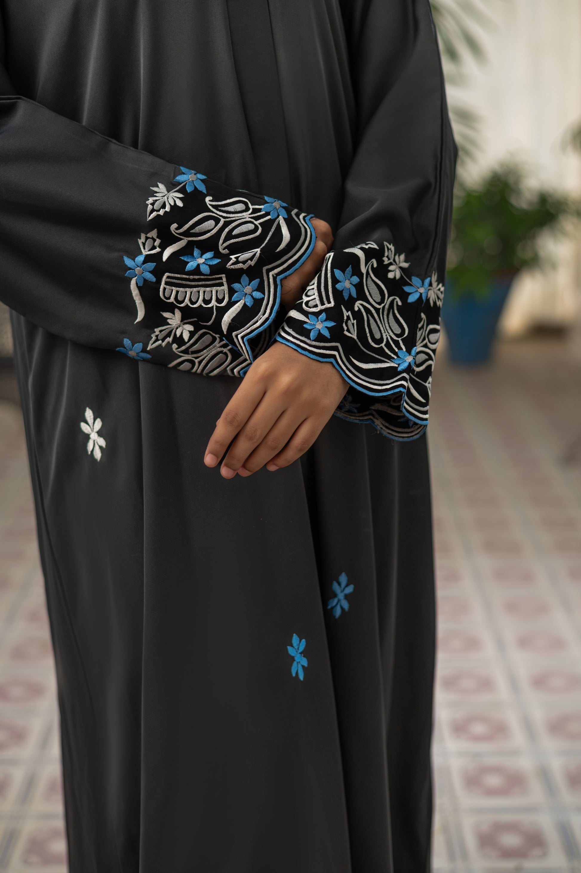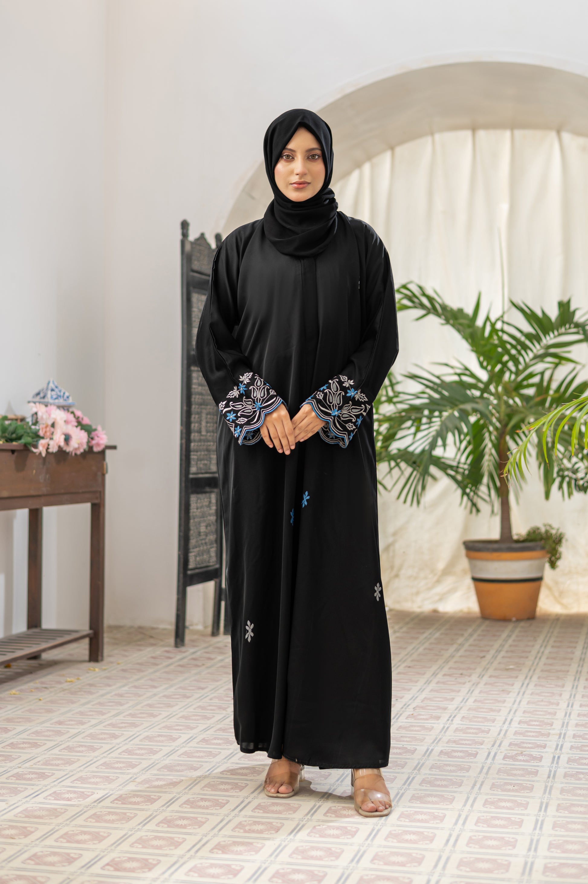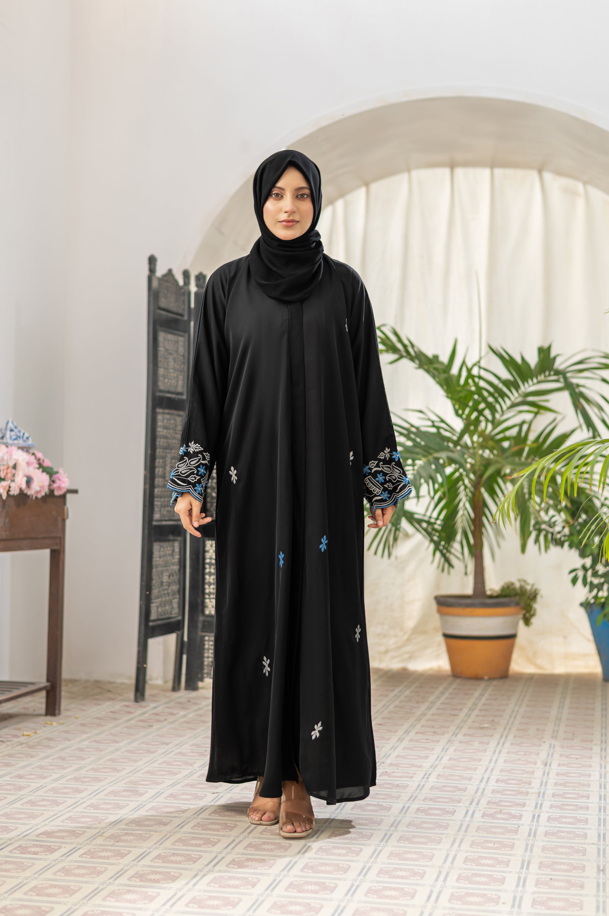 Elegance meets tradition with our Momina Black Abaya, designed for the woman who cherishes timeless grace. Crafted from premium fabric in classic black, this abaya features intricate embroidery on the sleeves and front, combining soft white and refreshing blue threads to create a beautifully modest look. The floral and geometric patterns add a subtle charm, making it perfect for both casual wear and special gatherings. The included matching hijab completes the sophisticated look, offering effortless coordination.