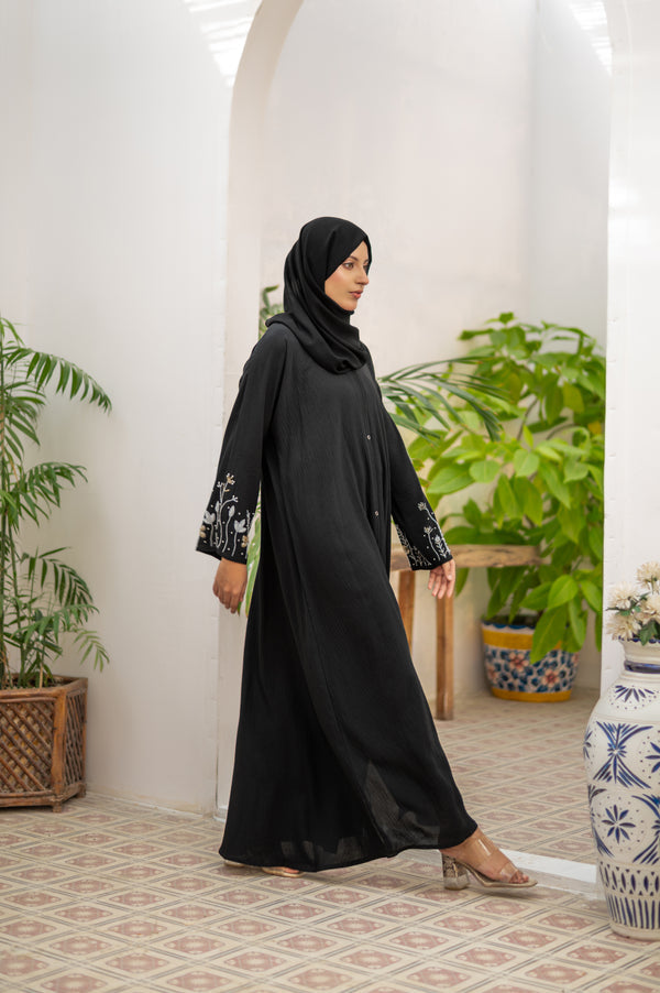 Experience timeless elegance with our black abaya crafted from premium Niddah fabric, known for its smooth texture and lightweight comfort. This abaya features delicate handwork on the sleeves, with intricate floral patterns embellished with white, gold, and silver beadwork—making it a graceful choice for both casual and formal wear.